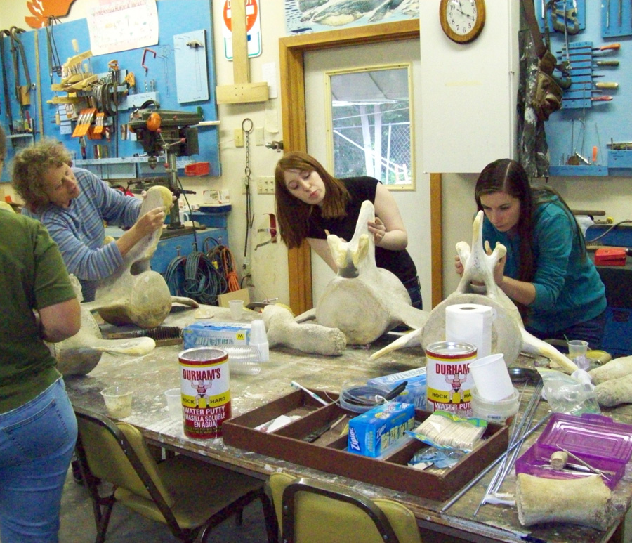 | Because of all the hard work by the many volunteers who had responded to our request, this project is now way ahead of schedule. With the repair of the the vertebrae finished, it was time to bring out the bones of the flippers, which had been originally scheduled to begin NEXT week! Woo Hoo! Great job!